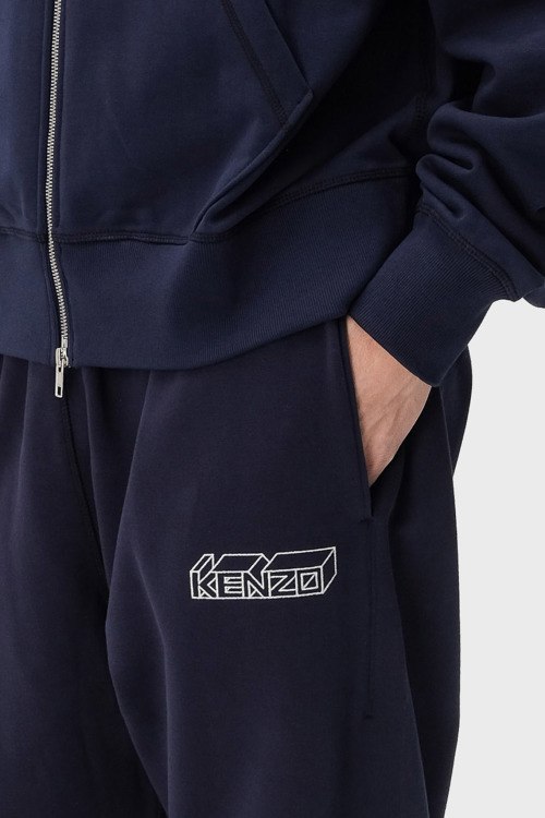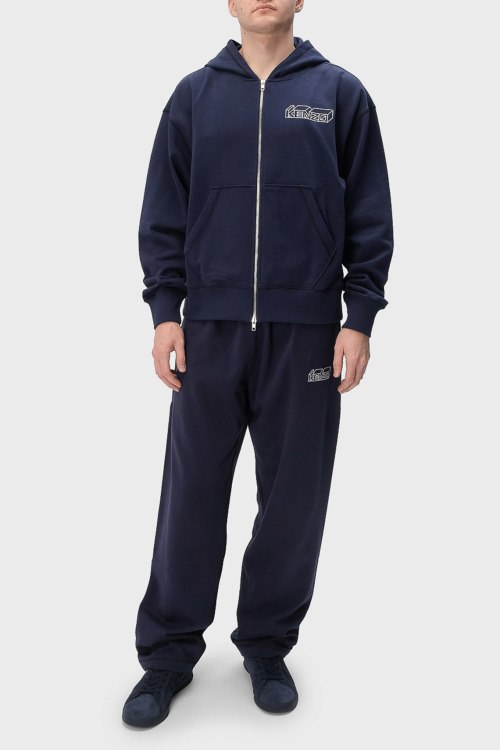 Детали: Мужской темно-синий спортивный костюм из хлопка от Kenzo (Кензо). Спортивная кофта на молнии, вшитый капюшон, манжеты и низ изделия в рубчик, накладные карманы, вышитый логотип бренда на груди и на спине. Спортивные брюки с эластичной резинкой на поясе и кулиской, прорезные карманы, вышитый логотип бренда