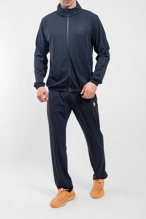 Мужской темно-синий спортивный костюм из хлопкового микса от Moncler (Монклер). Спортивная кофта на молнии, воротник-стойка, скрытый капюшон, боковые карманы на молнии, патч-лого. спортивные брюки прямого кроя, эластичная резинка на поясе с кулиской.