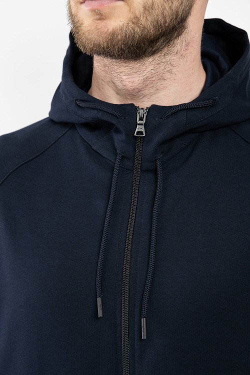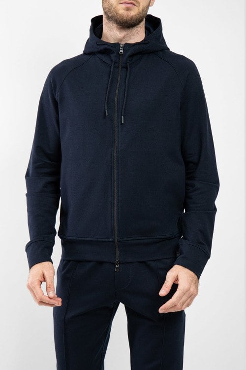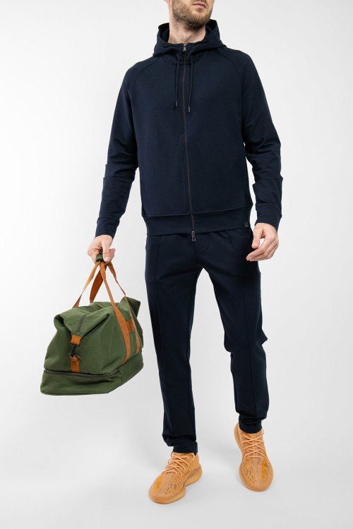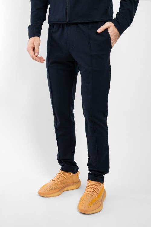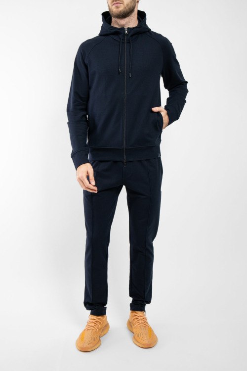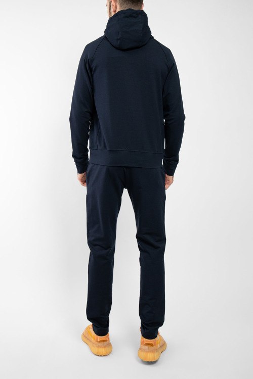 Мужской темно-синий спортивный костюм из хлопкового микса от Paul & Shark (Пол энд Шарк). Спортивная кофта на молнии, вшитый капюшон, рукава-реглан, прорезные карманы, спортивные брюки с манжетами, эластичная резинка на поясе с кулиской, прорезные карманы, патч-лого.