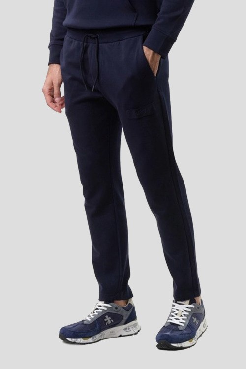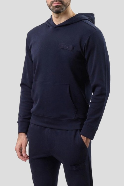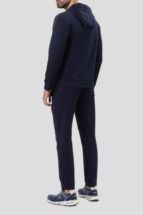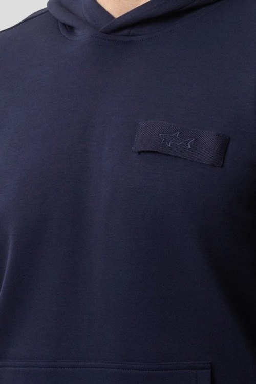 Детали: Мужской темно-синий хлопковый спортивный костюм от Paul & Shark (Пол энд Шарк). Худи: вшитый капюшон, нашивка с логотипом на груди, карман-кенгуру, классическая длина, трикотажные манжеты и нижний край. Брюки: эластичный пояс, боковые карманы, низ без манжетов, полная длина