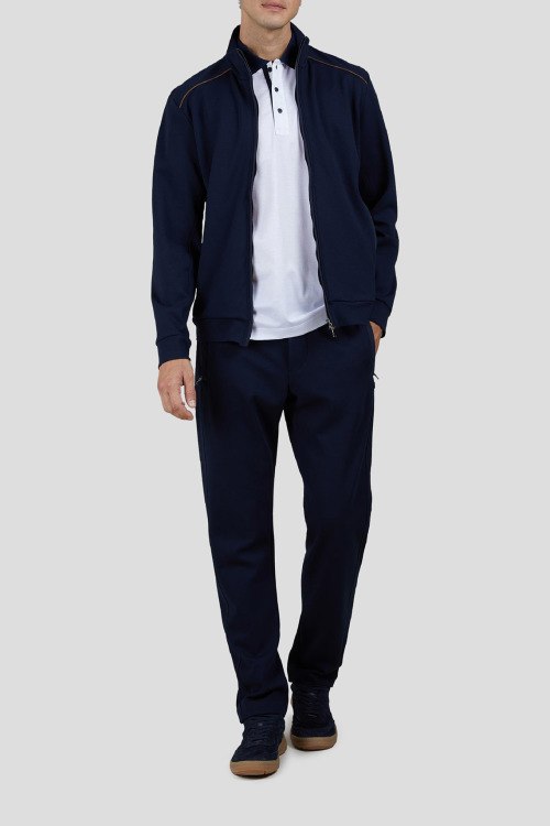 Детали: Мужской темно-синий спортивный костюм из вискозы от Paul & Shark (Пол энд Шарк). Спортивная кофта на на молнии, высокий воротник-стойка, застежка на молнию, контрастная вставка, трикотажная резинка на манжетах и по низу изделия, прорезные карманы. Спортивные брюки с эластичной резинкой на поясе, прорезные карманы
