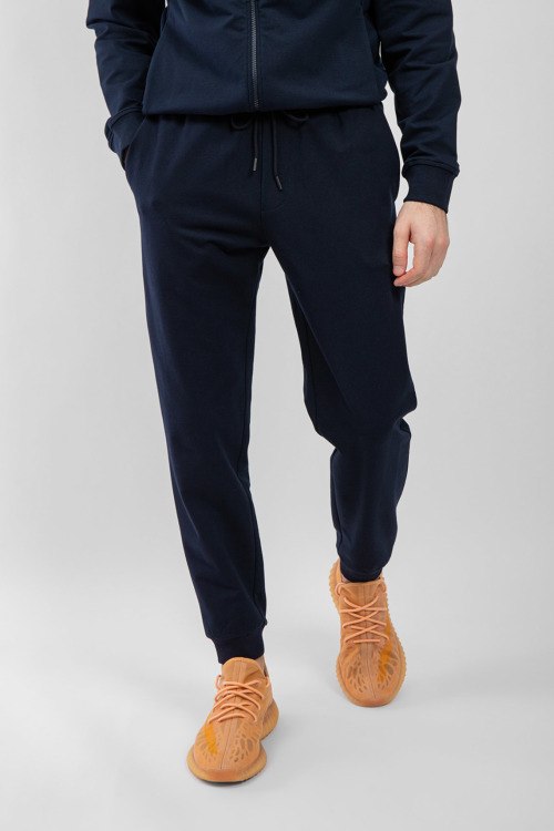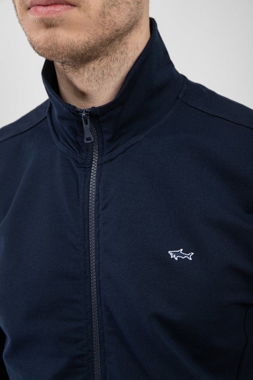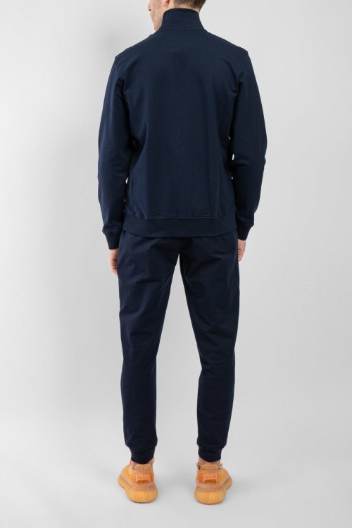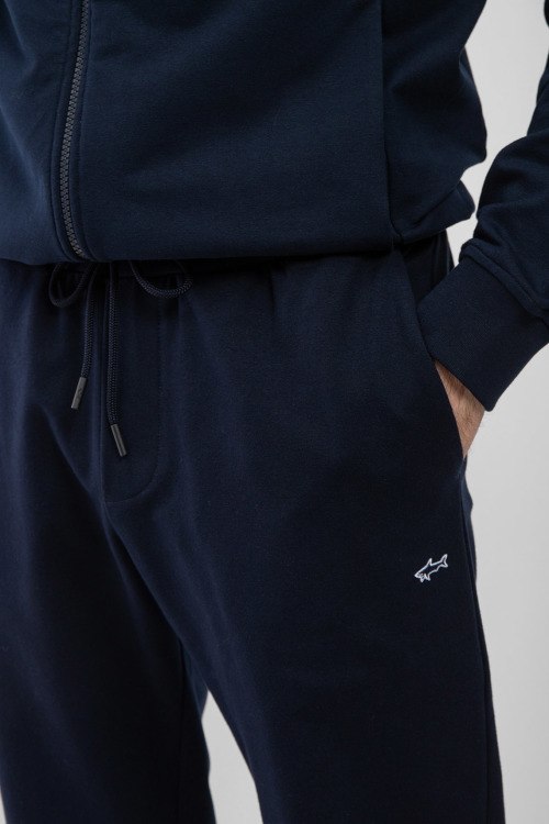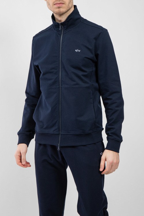 Мужской темно-синий спортивный костюм из хлопкового микса от Paul & Shark (Пол энд Шарк). Спортивная кофта на молнии, высокий воротник-стойка, застежка на молнию, прорезные карманы, логотип бренда на груди, трикотажная резинка на манжетах и по низу изделия, спортивные брюки с манжетами, эластичная резинка на поясе с кулиской, прорезные карманы.