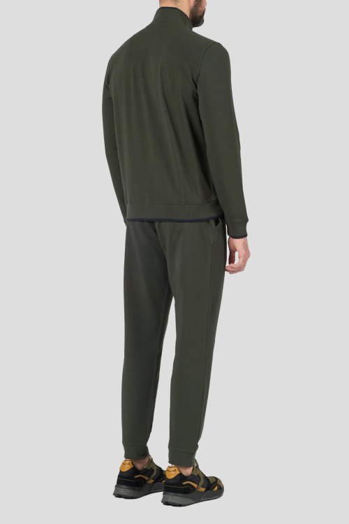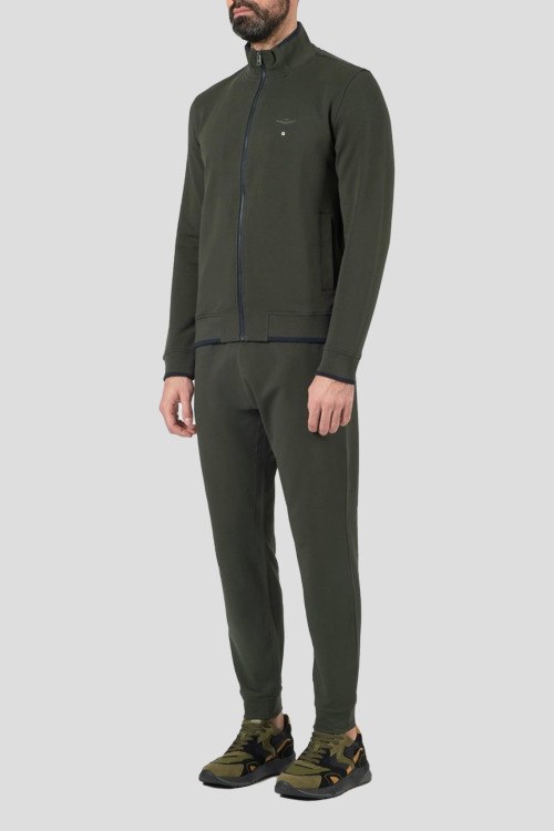 Детали: Мужской темно-зеленый хлопковый спортивный костюм от Aeronautica Militare (Аэронавтика Милитари). Кофта: логотип на груди, боковые карманы, застежка-молния, классическая длина, трикотажные манжеты и нижний край. Брюки: эластичный пояс на завязках, боковые карманы, трикотажные манжеты, полная длина. Параметры модели: 108-83-99, рост 189 см. На модели надет: L размер
