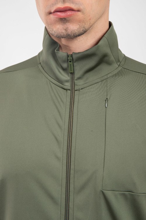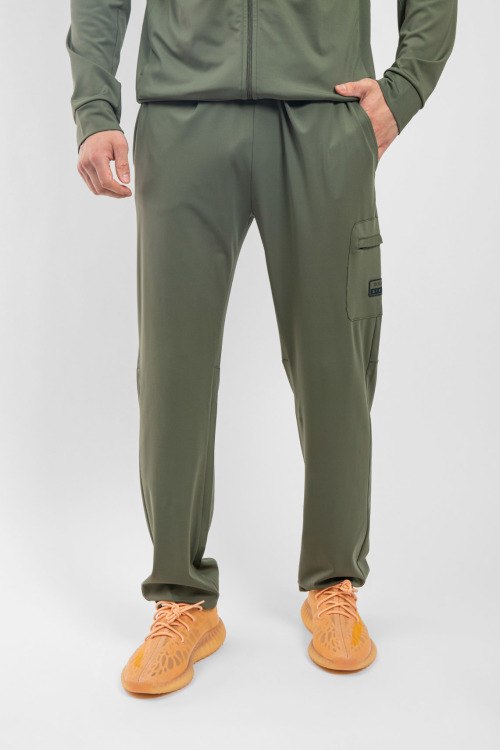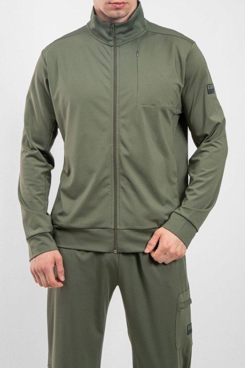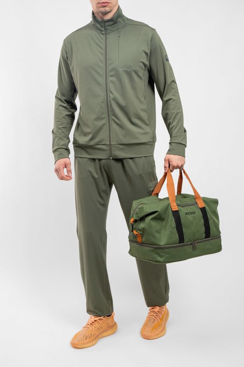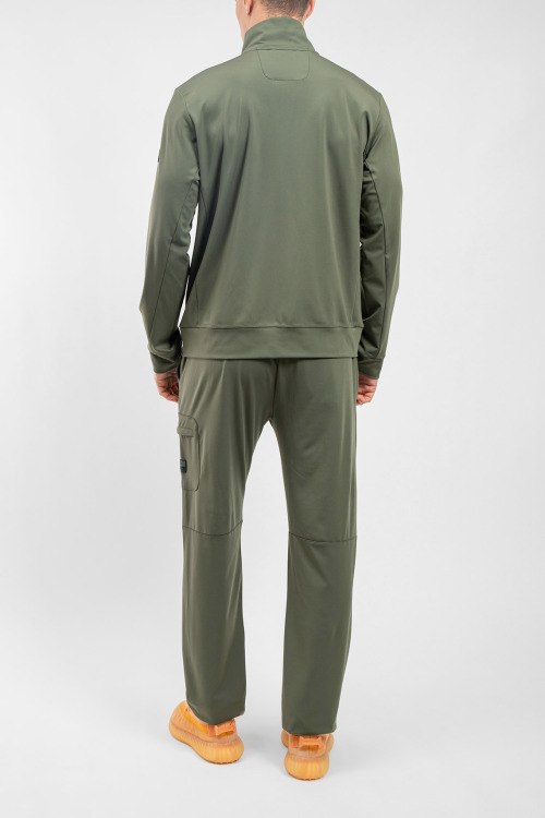 Мужской оливковый спортивный костюм из хлопкового микса от Boggi (Богги). Спортивная кофта на молнии, воротник-стойка, прорезные карманы, нагрудный карман на молнии. спортивные брюки прямого кроя, кулиска в поясе, прорезные карманы, накладной карман сбоку, патч-лого.
