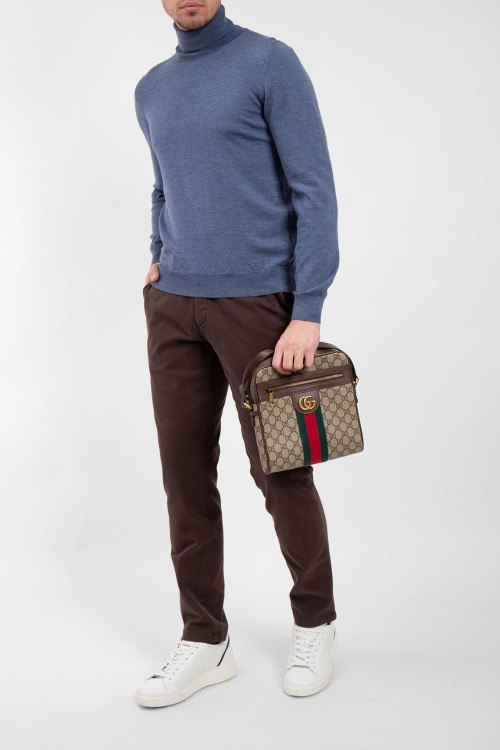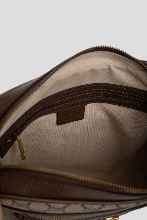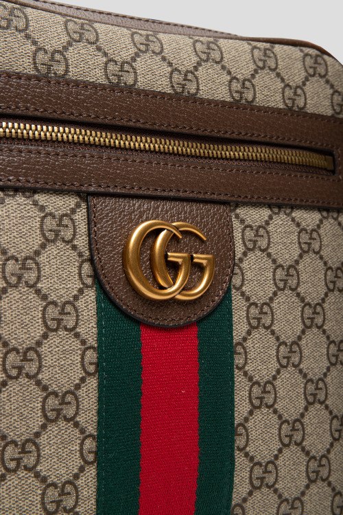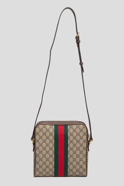 Мужская бежевая сумка через плечо Ophidia из текстиля от Gucci (Гуччи). Одно отделение, застежка на молнию, внутренний карман на молнии, внешний карман на молнии, дизайн с монограммой по всей поверхности изделия, металлический логотип бренда, регулируемый плечевой ремень. Измерения: высота: 25 см; ширина: 23 см; глубина: 5 см