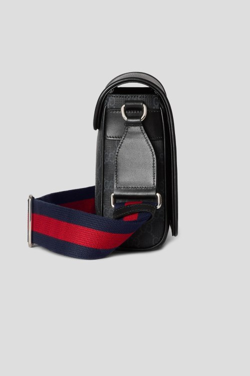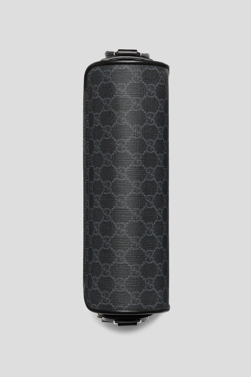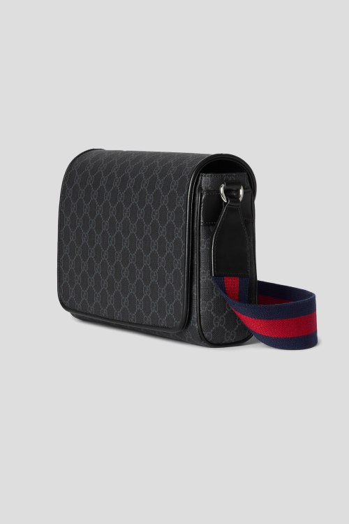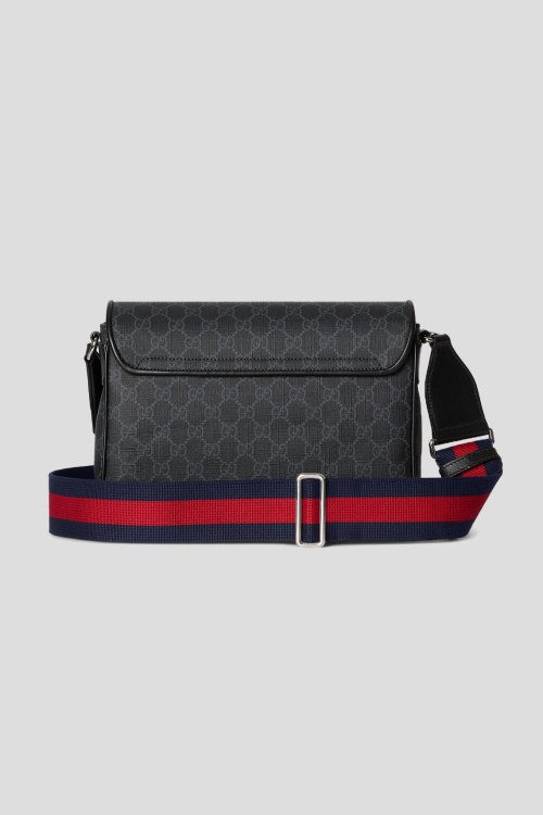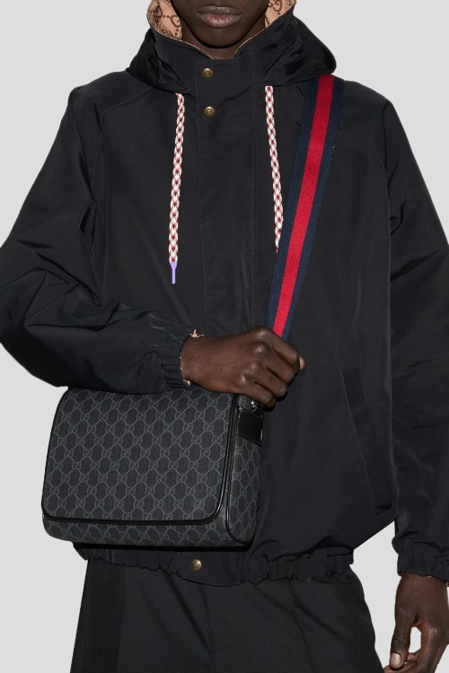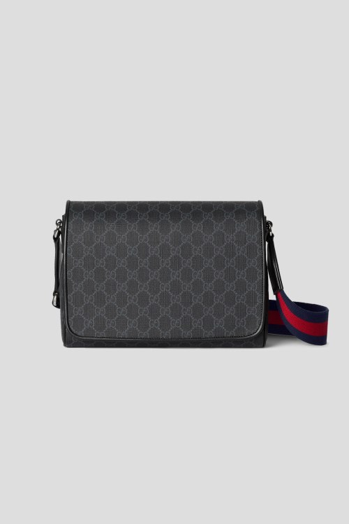 Детали: Мужская черная сумка мессенджер из канвы GG Supreme от Gucci (Гуччи). Монограмма GG по всей поверхности, серебристая фурнитура, магнитная застежка, одно отделение, текстильный плечевой ремень с полоской Web. Размеры: ширина - 27 см, глубина - 9 см, высота - 20 см