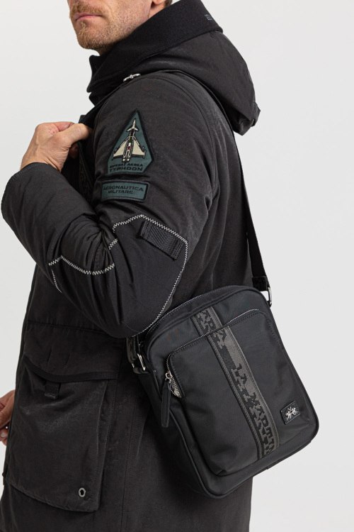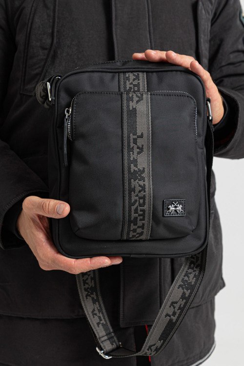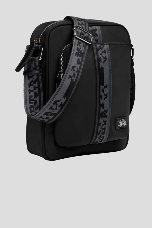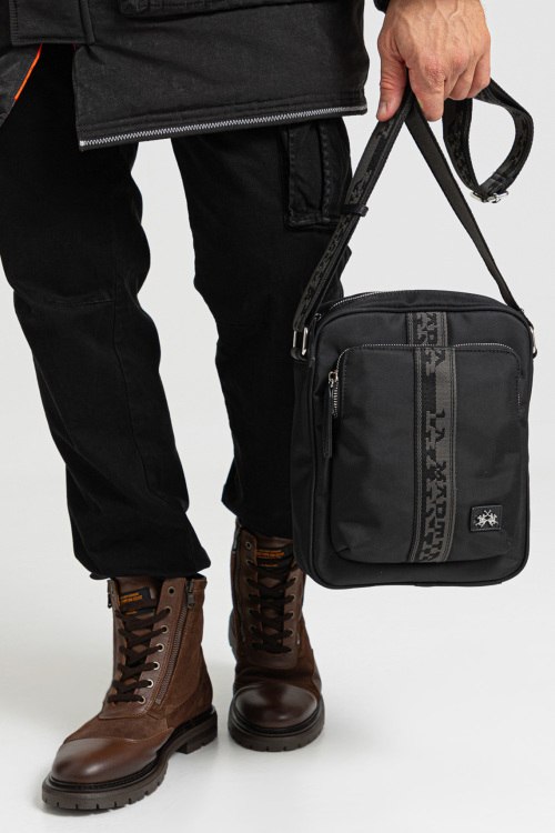 Детали: Мужская черная сумка мессенджер из нейлона и экокожи от La Martina (Ла Мартина). Комбинация материалов, внешний карман на молнии, застежка-молния, одно отделение, регулируемый плечевой ремень. Размер: 22 × 8 × 27 см