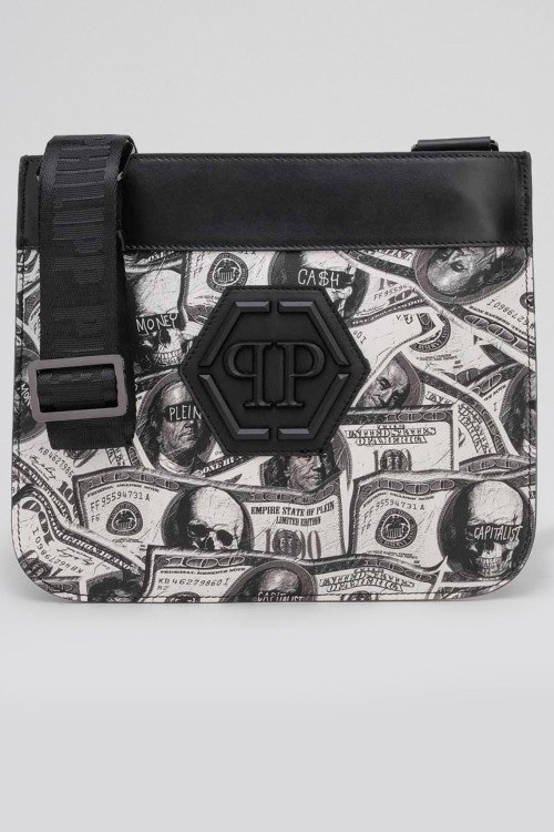 Детали: Мужская сумка-планшет из натуральной кожи от Philipp Plein (Филипп Плейн). Модель квадратной формы c принтом Dollar по всей поверхности, застежка на молнию, несъемный регулируемый ремень, наружный карман на молнии, фирменный логотип бренда. Измерения: 20х24см