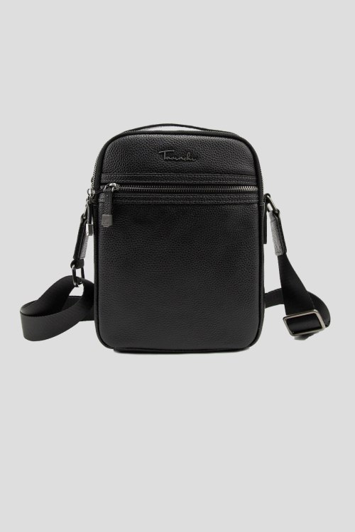 Детали: Мужская черная сумка через плечо из натуральной кожи от Tavinchi (Тавинчи). Два отделения, застежка на молнию, внутренние карманы, регулируемый плечевой ремень, тиснение с логотипом бренда. Размер: 20 x 26 x 8 см.