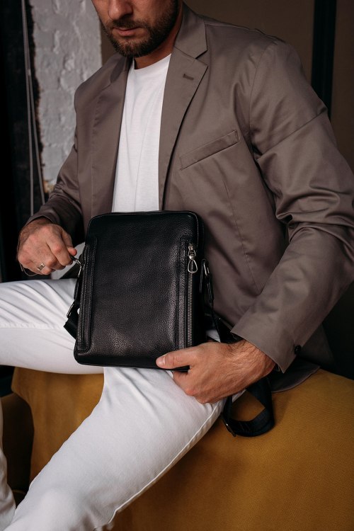 Детали: Мужская черная кожаная сумка-мессенджер от Tiding Bag (Тайдинг Бег). Сумка имеет одно основное отделение, внутри которого карман на молнии и один открытый карман. С тыльной стороны карман на молнии с лицевой стороны два кармана на молнии вертикального типа. Размеры: 19 x 24 x 4 см