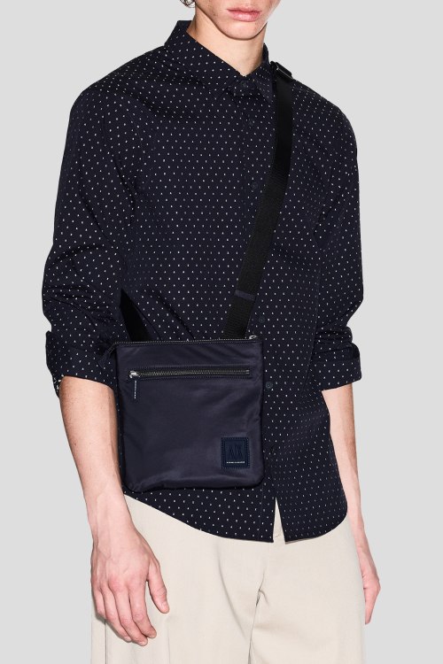 Детали: Мужская темно-синяя нейлоновая сумка мессенджер от Armani Exchange (Армани Эксчендж). Нашивка с логотипом, внешний карман на молнии, застежка-молния, одно отделение, регулируемый плечевой ремень. Размеры: 21 х 22 х 1 см