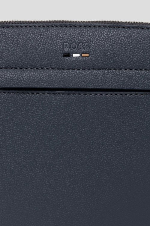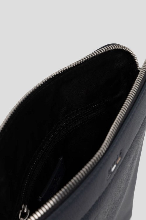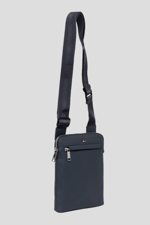 Детали: Мужская темно-синяя сумка мессенджер из экокожи Ray от Hugo Boss (Хуго Босс). Модель из зернистой кожи, тиснение логотипа, серебристая фурнитура, внешний карман на молнии, застежка-молния, одно отделение, регулируемый плечевой ремень. Размеры: 21 х 24 х 3,5 см