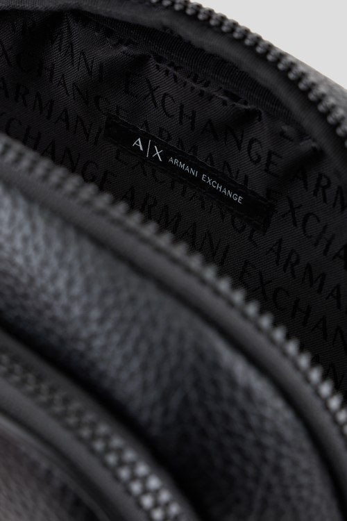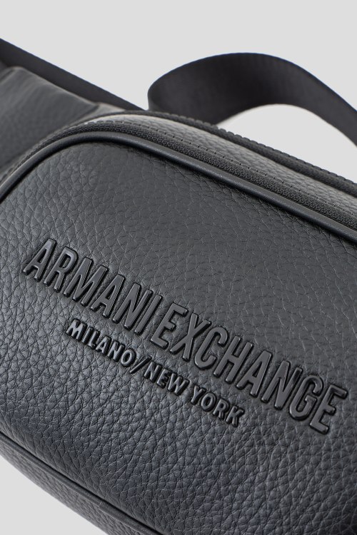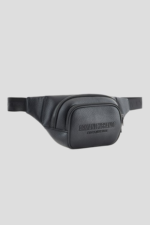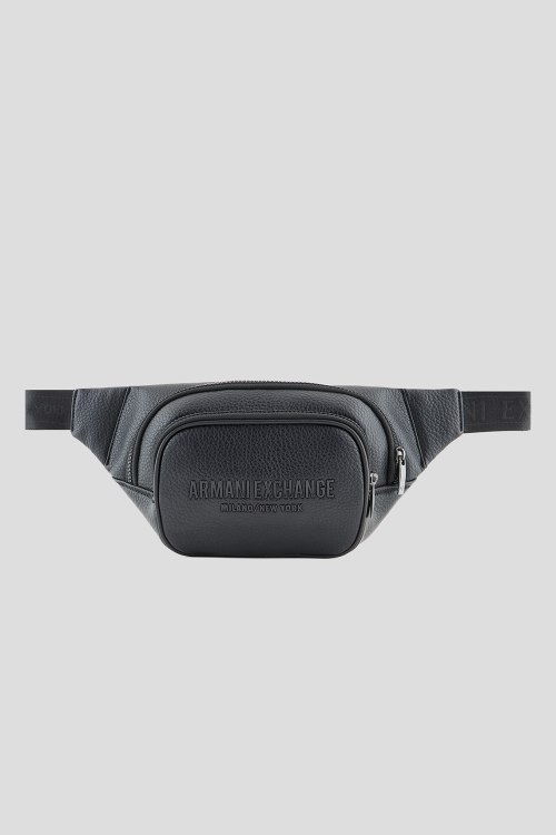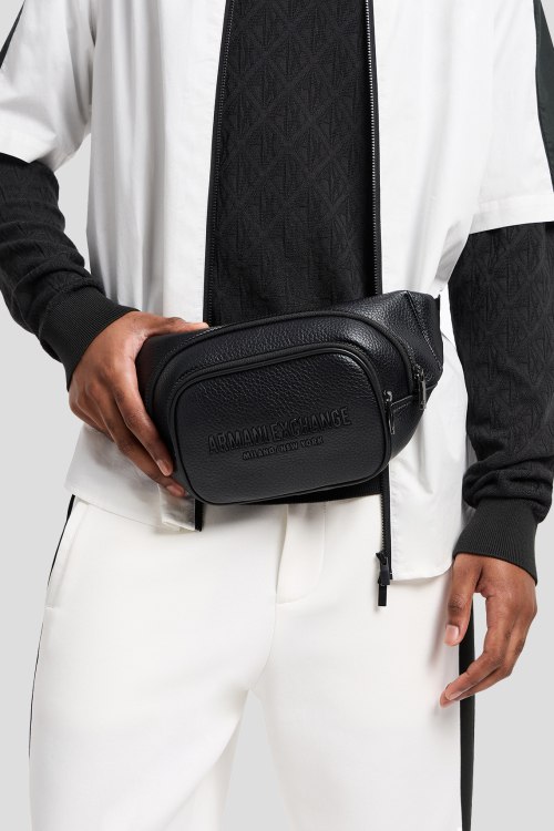 Детали: Мужская черная сумка на пояс из экокожи от Armani Exchange (Армани Эксчендж). Значок с логотипом, внешний карман на молнии, застежка-молния, одно отделение, регулируемый поясной ремень. Размеры: 36.5 х 16 х 6 см