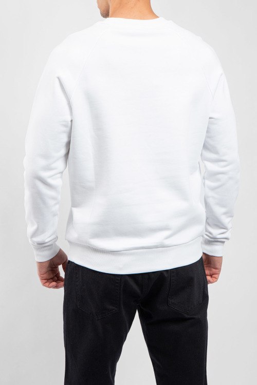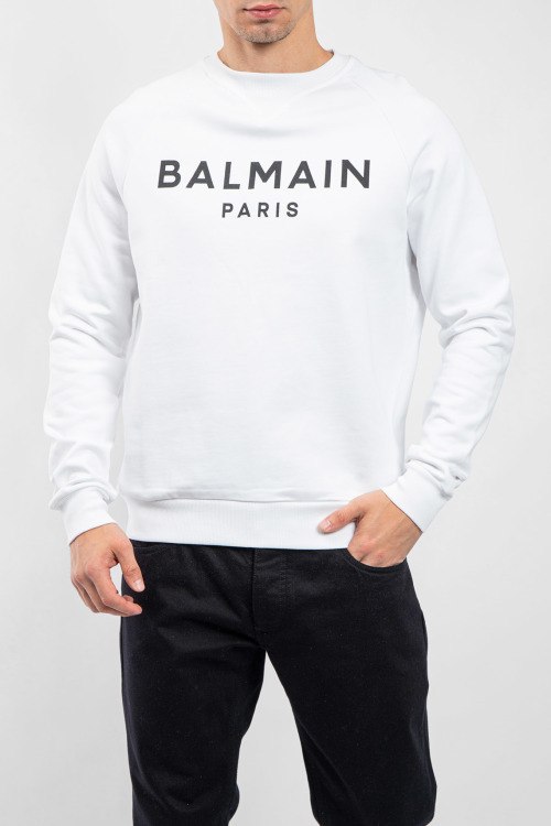 Мужской белый хлопковый свитшот от Balmain (Бальман). Принт с логотипом на груди, круглый вырез горловины, классическая длина, трикотажные манжеты и нижний край.