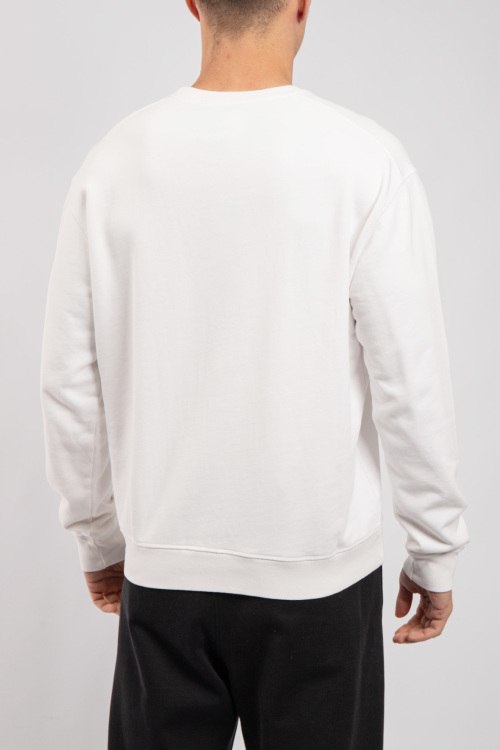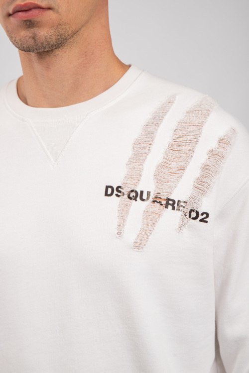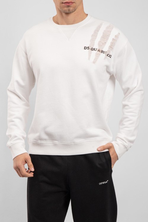 Мужской белый хлопковый свитшот от Dsquared2 (Дискваред). Принт с логотипом, дизайн с потертостями, круглый вырез горловины, классическая длина, трикотажные манжеты и нижний край.