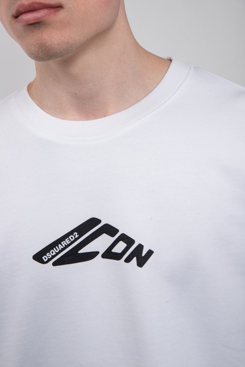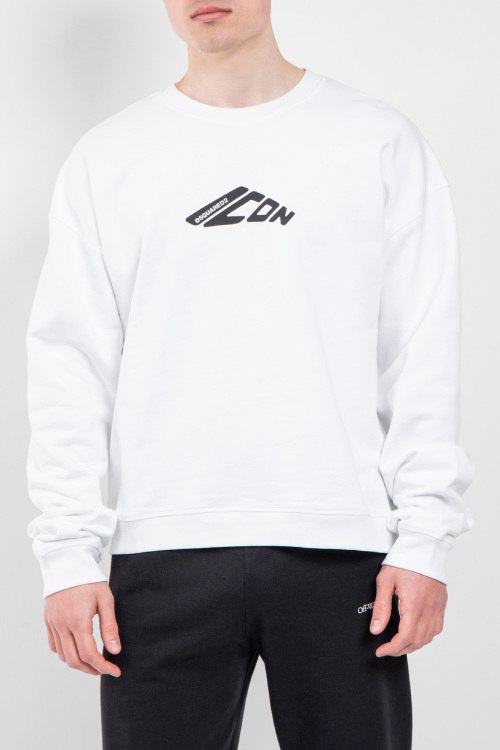 Мужской белый свитшот Icon из хлопка от Dsquared2 (Дискваред). Классическая длина, круглый вырез горловины, длинные рукава, трикотажная резинка на манжетах и по низу изделия, брендированный принт.