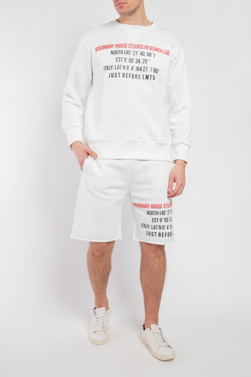 Мужской белый свитшот из уплотненного хлопка от J.B4 Just Before (Джаст Бифо). Классическая длина, круглый вырез горловины, длинные рукава, трикотажная резинка на манжетах и по низу изделия, дизайн с принтом спереди.