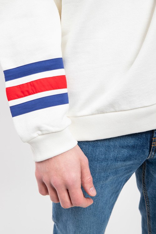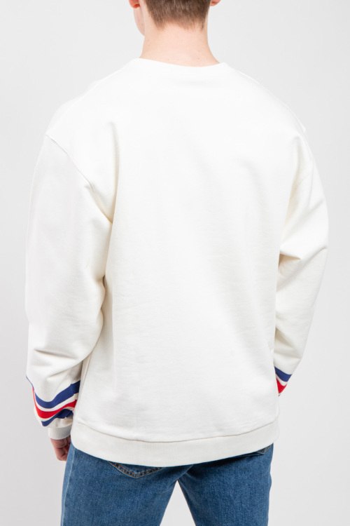 Мужской светло-бежевый свитшот из хлопка от Gucci (Гуччи). Классическая длина, круглый вырез горловины, длинные рукава, трикотажная резинка на манжетах и по низу изделия, дизайн с контрастными вставками, логотип бренда.