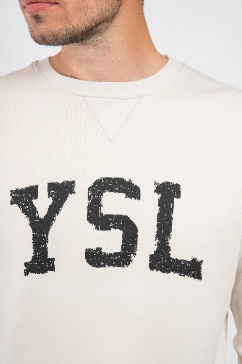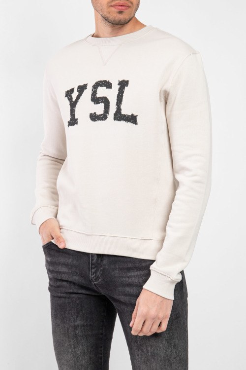Мужской бежевый свитшот из хлопка от Yves Saint Laurent (Сен Лоран). Круглый вырез горловины, длинные рукава, трикотажная резинка на манжетах и по низу изделия, принт с логотипом бренда на груди.
