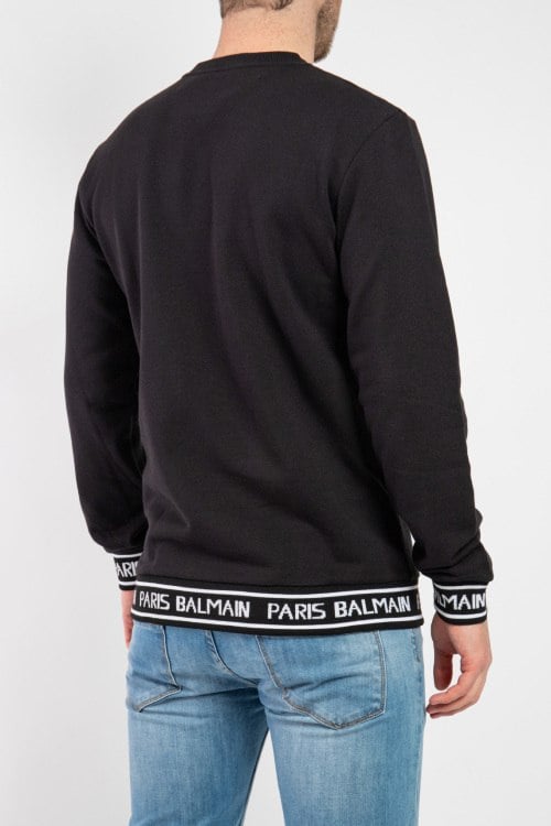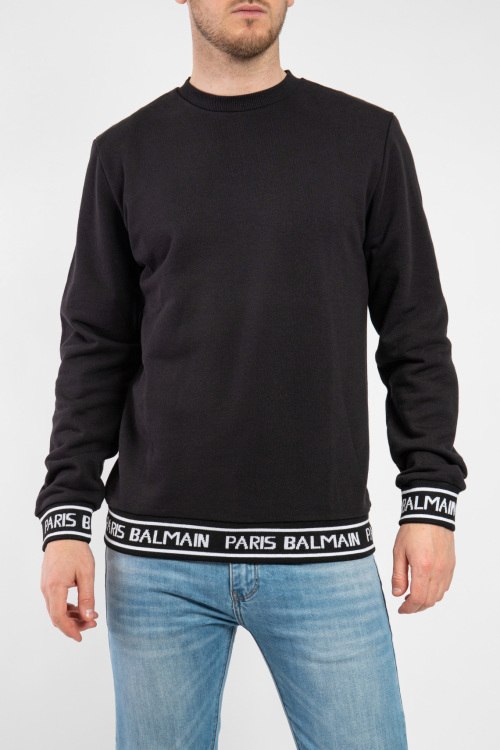Свитшот черного цвета, выполнен из натурального хлопка. Однотонная модель, круглый вырез горловины, длинный рукав, трикотажная резинка на манжетах и по низу изделия с фирменным логотипом бренда
