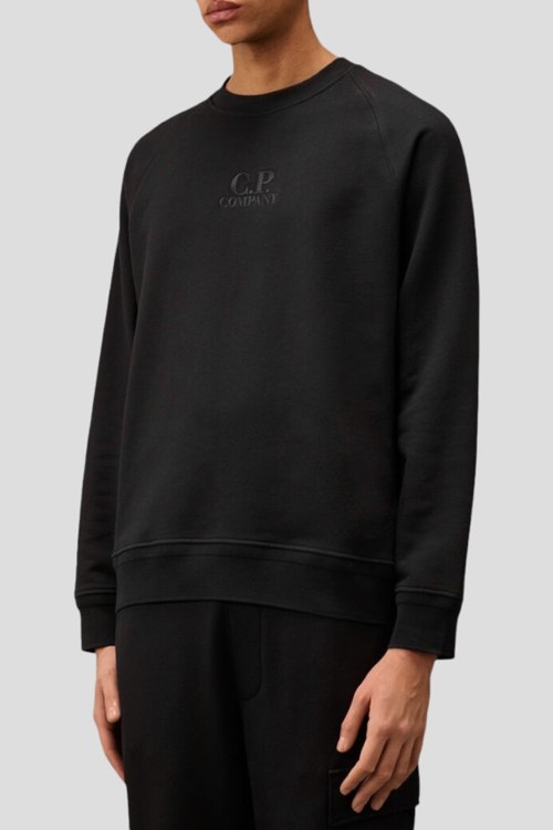 Детали: Мужской черный свитшот из хлопка от C.P. Company (СиПи Компани). Классическая длина, круглый вырез горловины, длинные рукава-реглан, трикотажная резинка на манжетах и по низу изделия, вышитый логотип бренда
