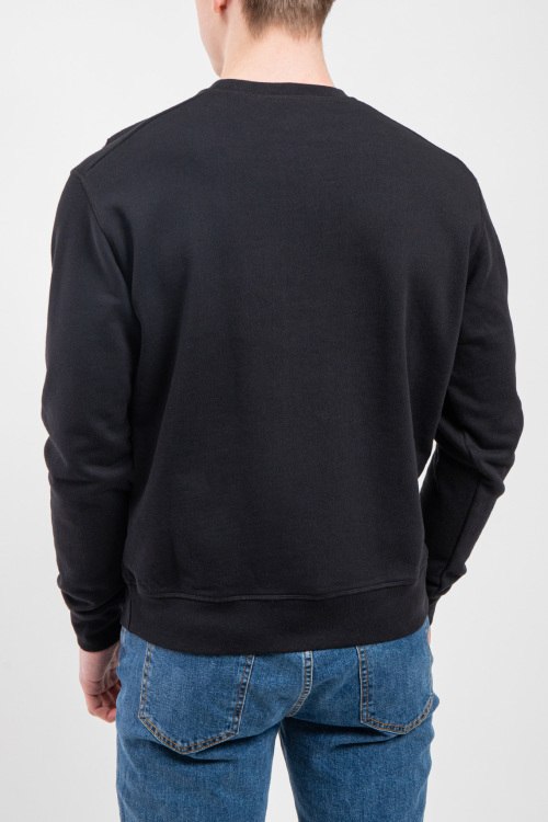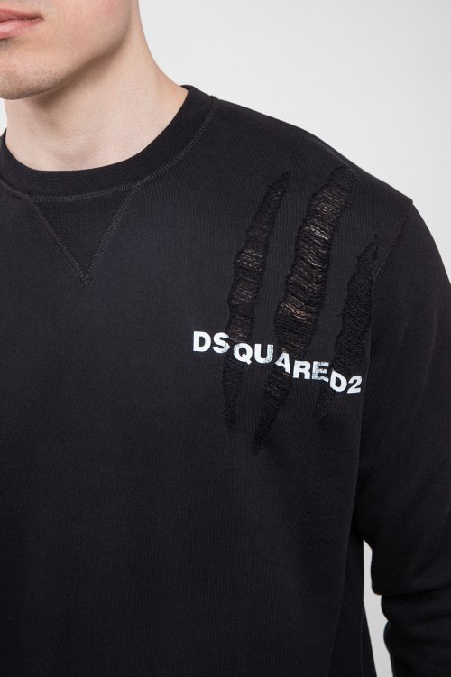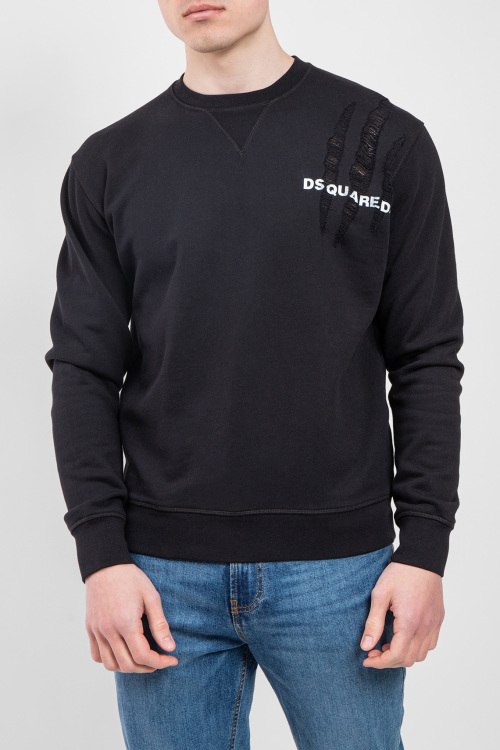 Мужской черный свитшот из хлопка от Dsquared2 (Дискваред). Классическая длина, круглый вырез горловины, длинные рукава, дизайн с потертостями, принт с логотипом бренда, трикотажная резинка на манжетах и по низу изделия.