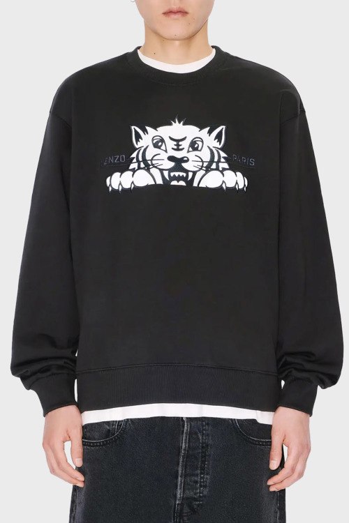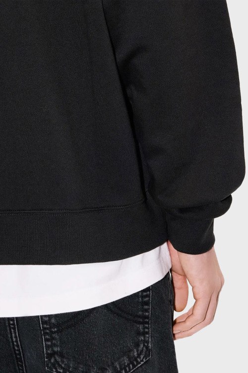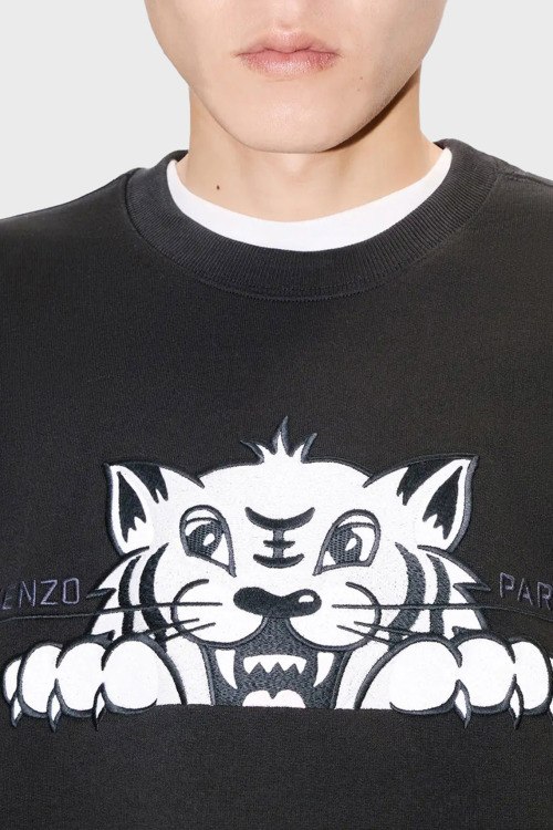 Детали: Мужской черный свитшот из хлопка от Kenzo (Кензо). Классическая длина, круглый вырез горловины, трикотажаня резинка на манжетах и по низу изделия, вышитый логотип бренда