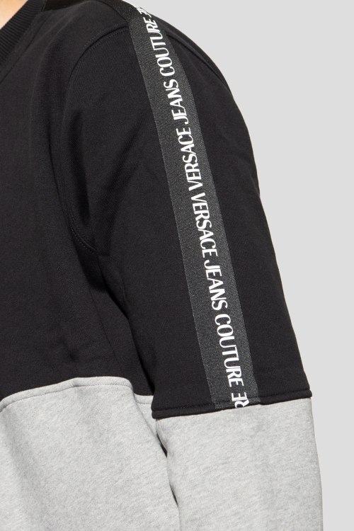 Детали: Мужской черно-серый свитшот из хлопка от Versace (Версаче). Классическая длина, круглый вырез горловины, длинные рукава, дизайн в стиле колор-блок, брендированные лампасы на рукавах, трикотажная резинка на манжетах и по низу изделия, модель на флисе