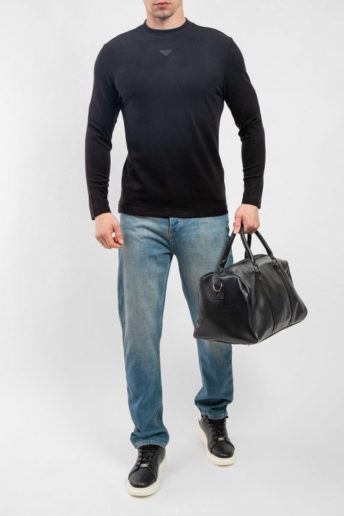 Мужской черный лонгслив из хлопка от Prada (Прада). Классическая длина, круглый вырез горловины, длинные рукава, патч-лого на груди. На модели снят размер - 52. Параметры модели: рост 189 см, 103-78-104 см