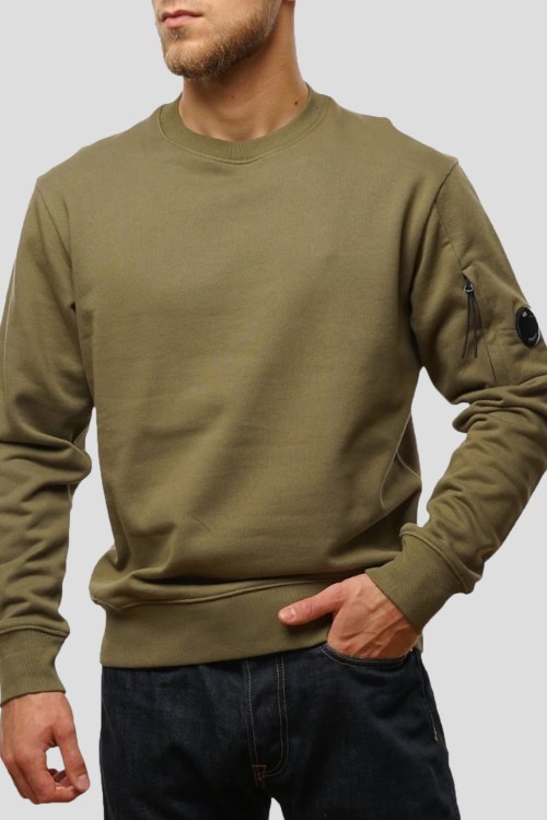 Детали: Мужской хлопковый свитшот цвета хаки от C.P. Company (СиПи Компани). Нашивка с логотипом на рукаве, круглый вырез горловины с логотипом сзади, классическая длина, трикотажные манжеты и нижний край