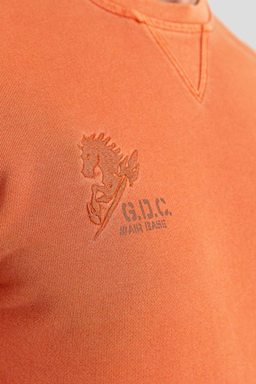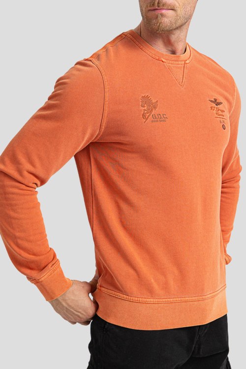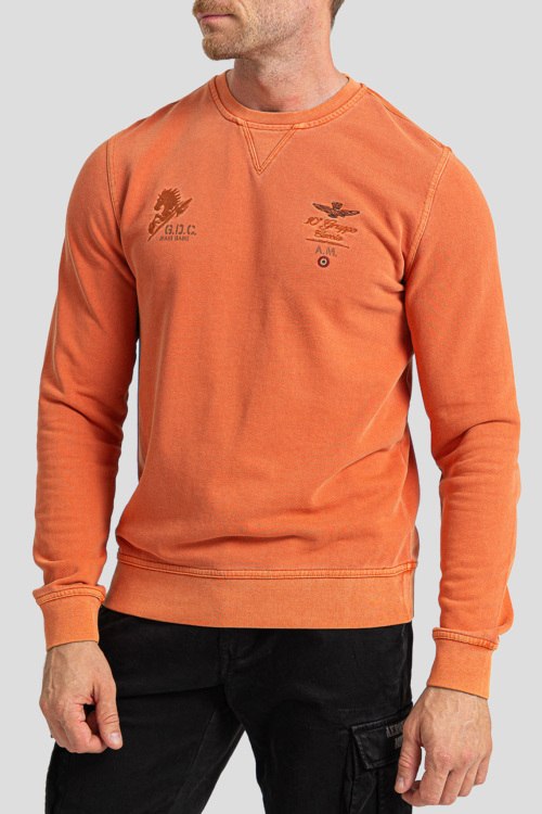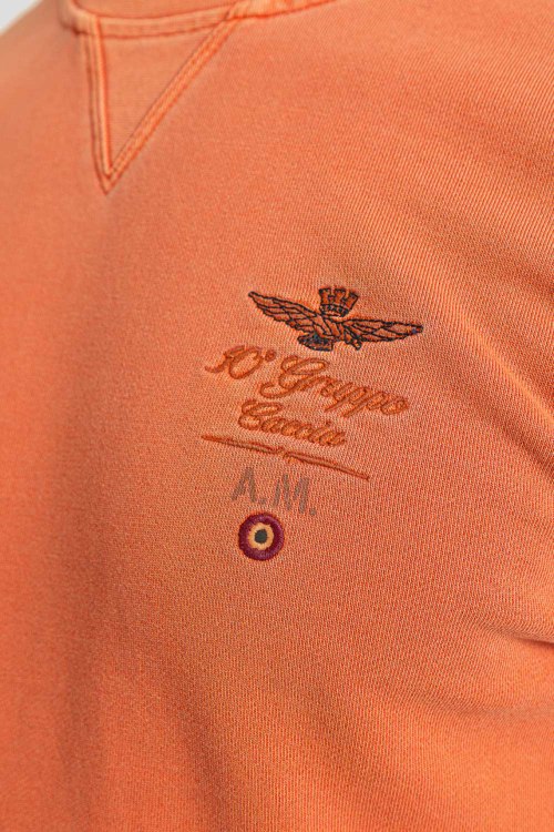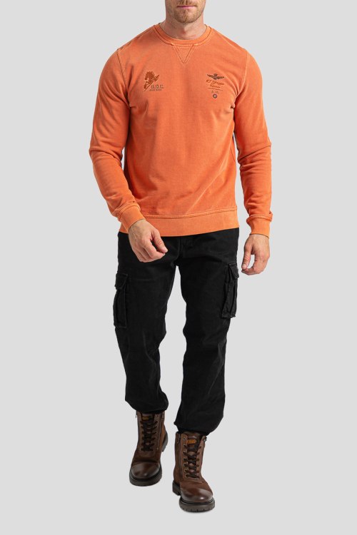 Детали: Мужской оранжевый свитшот X Gruppо из хлопка от Aeronautica Militare (Аэронавтика Милитари). Классическая длина, круглый вырез горловины, длинные рукава, трикотажная резинка на манжетах и понизу изделия, вышитый логотип бренда на груди