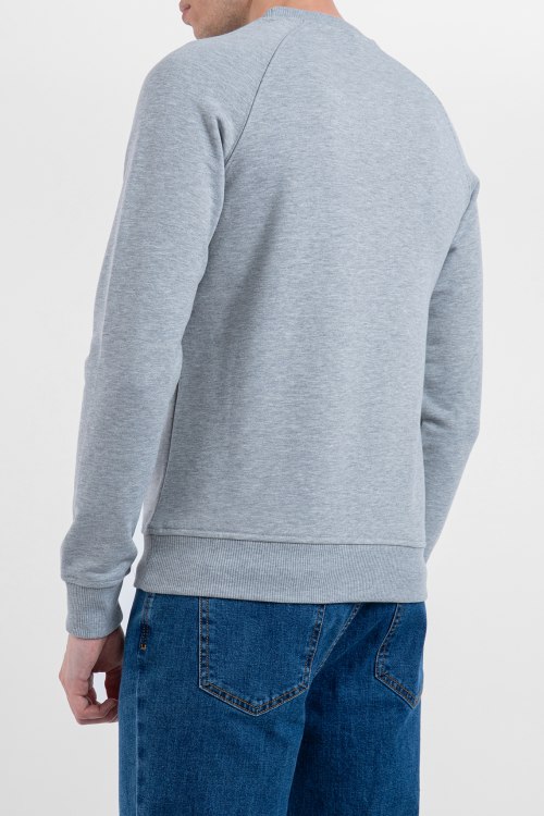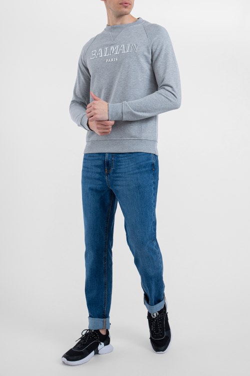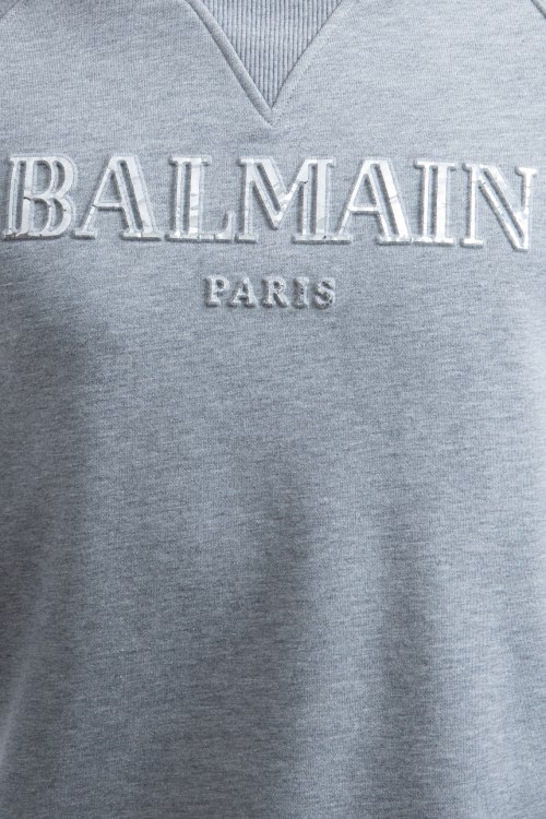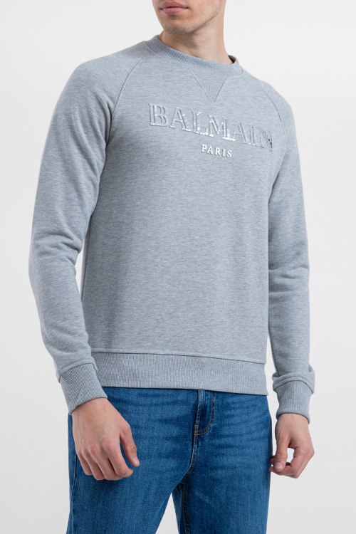 Мужской серый хлопковый свитшот от Balmain (Бальман). Логотип на груди с эффектом металлик, круглый вырез горловины, трикотажные манжеты и нижний край.