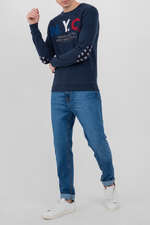 Мужской темно-синий хлопковый свитшот от Fred Mello (Фред Мелло). Принт спереди, круглый вырез горловины, трикотажные манжеты и нижний край.