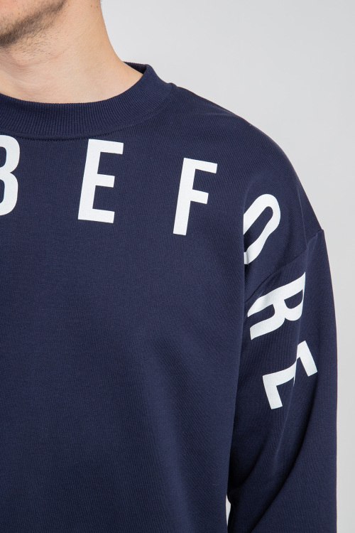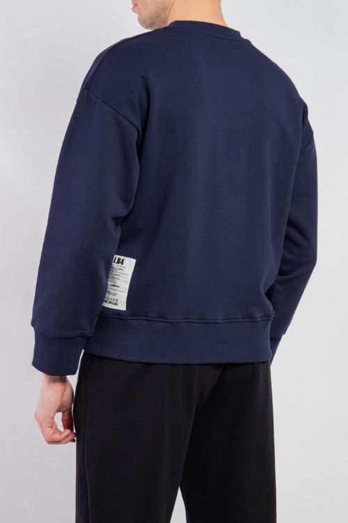 Мужской темно-синий свитшот из уплотненного хлопка от J.B4 Just Before (Джаст Бифо). Классическая длина, круглый вырез горловины, длинные рукава, трикотажная резинка на манжетах и по низу изделия, принт с логотипом бренда, патч-лого.