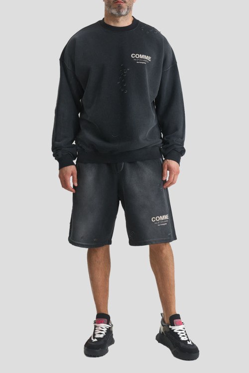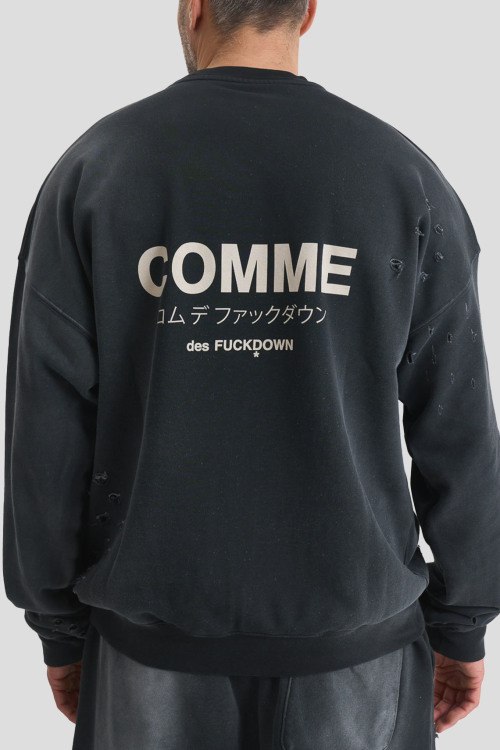Детали: Мужской темно-серый хлопковый свитшот от Comme des Fuckdown (Камм дес Факдаун). Дизайн с рваными деталями, принт с логотипом на груди и на спине, круглый вырез горловины, классическая длина, трикотажные манжеты и нижний край