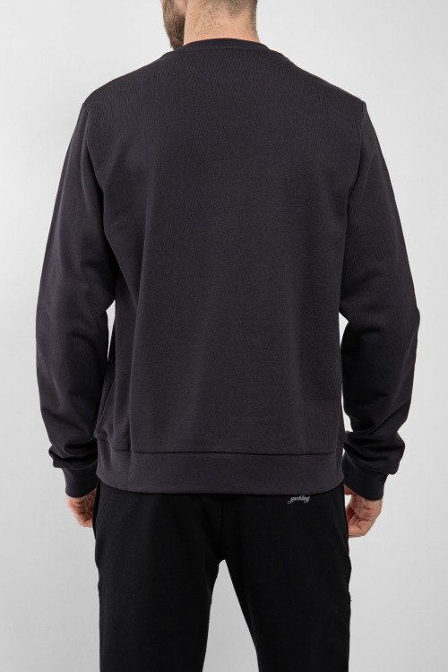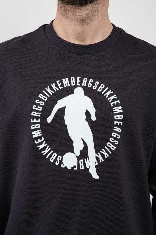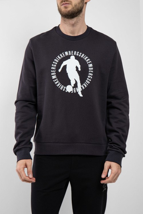 Мужской темно-серый свитшот из хлопка от Bikkembergs (Биккембергс). Круглый вырез горловины, длинные рукава, манжеты и низ изделия на трикотажной резинке, брендированный принт на груди.