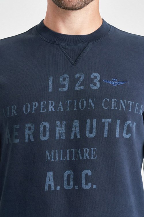 Детали: Мужской темно-синий хлопковый свитшот от Aeronautica Militare (Аэронавтика Милитари). Принт с логотипом спереди, круглый вырез горловины, классическая длина, трикотажные манжеты и нижний край