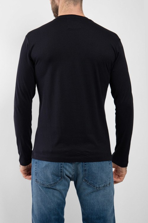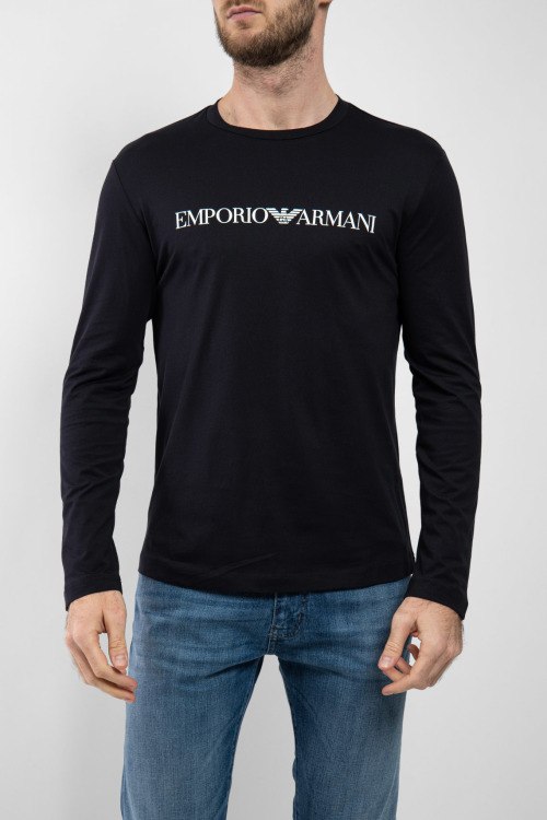 Детали: Мужской темно-синий лонгслив из хлопка от Armani (Армани). Классическая длина, круглый вырез горловины, длинные рукава, брендированный принт на груди