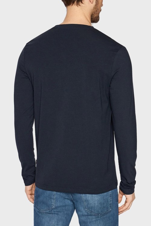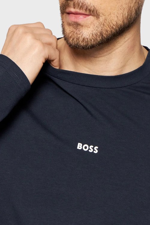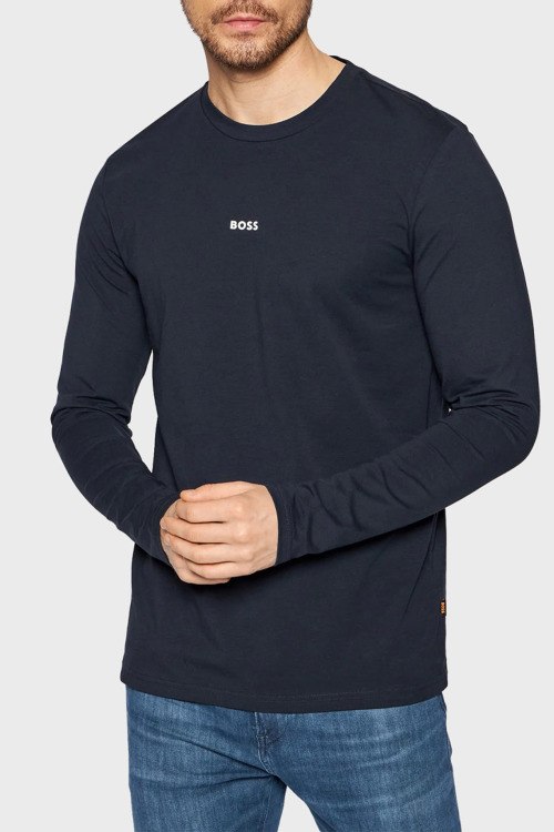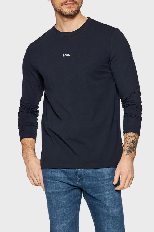 Детали: Мужской темно-синий лонгслив Heren из хлопкового микса от Hugo Boss (Хуго Босс). Классическая длина, круглый вырез горловины, длинные рукава, логотип бренда на груди
