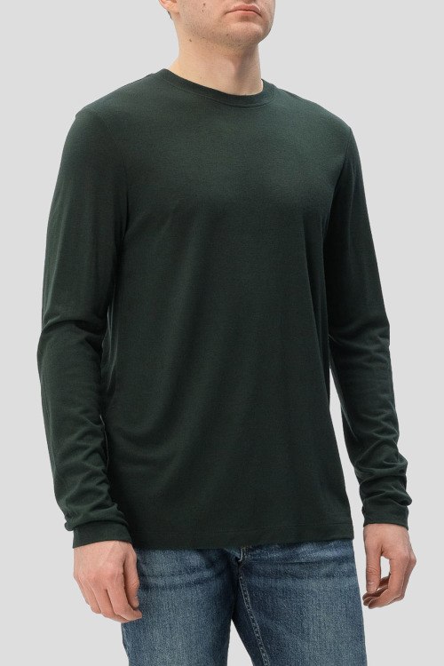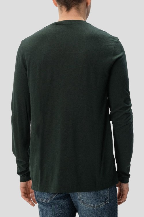 Детали: Мужской темно-зеленый лонгслив из вискозы и шерсти от Hugo Boss (Хуго Босс). Классическая длина, круглый вырез горловины, длинные рукава