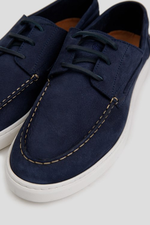 Мужские темно-синие замшевые топсайдеры от Harmont & Blaine (Хармонт энд Блейн). Закругленный носок, спереди классическая шнуровка, рельефная подошва белого цвета, вышитый логотип бренда