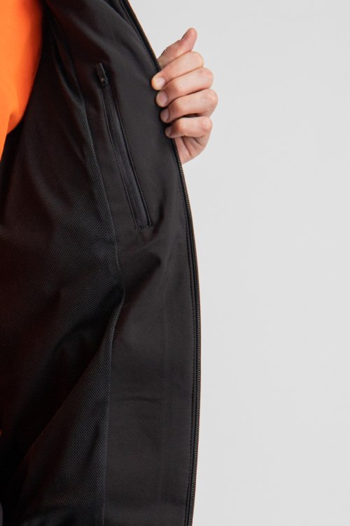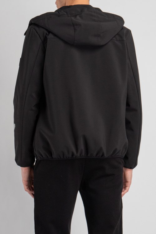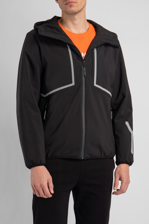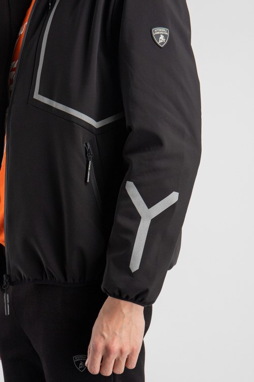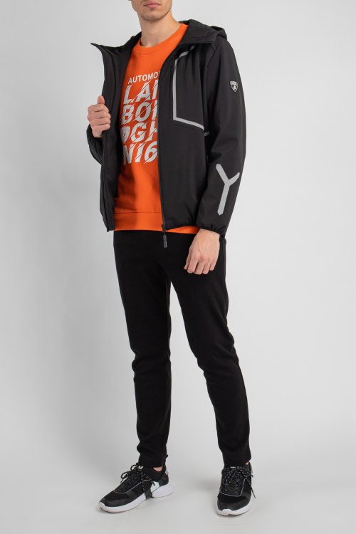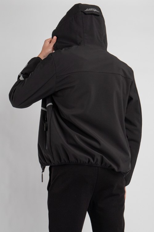Мужская черная спортивная куртка от Automobili Lamborghini (Автомобили Ламборгини). Классическая длина, вшитый капюшон, застежка на молнию, боковые карманы на молнии, светоотражающий принт