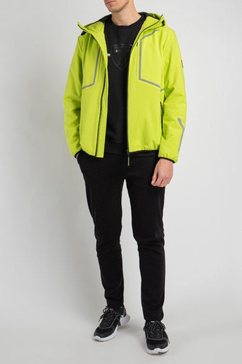 Детали: Мужская салатовая куртка для спорта от Automobili Lamborghini (Автомобили Ламборгини). Классическая шнуровка, вшитый капюшон, застежка на молнию, боковые карманы на молнии, внутренний карман, патч-лого, светоотражающие элементы