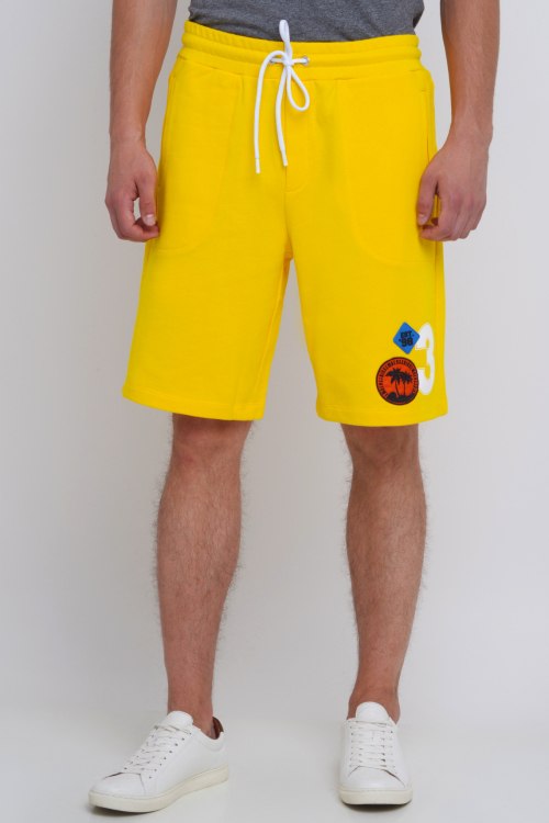Детали: Спортивные шорты желтого цвета, выполнены из натурального хлопка. Модель длиной до колен, эластичная резинка на поясе с кулиской, боковые карманы, нашивка с фирменным логотипом бренда