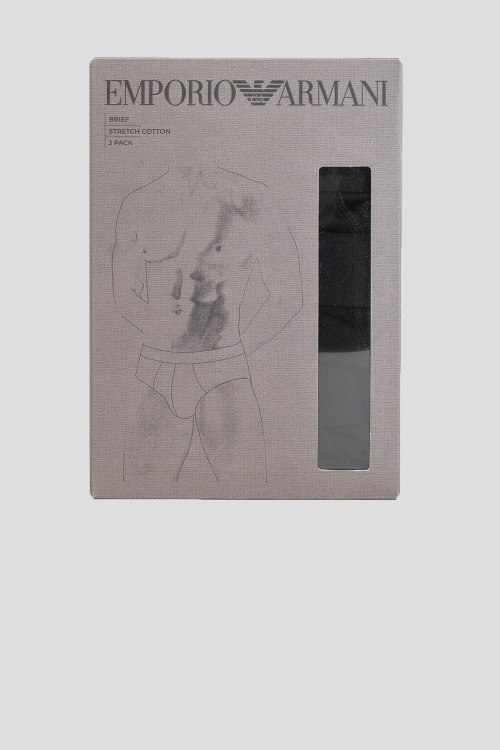 Детали: Мужской набор хлопковых черных трусов от Emporio Armani (Эмпорио Армани). Фасон-брифы, эластичный брендированный пояс. В наборе три пары
