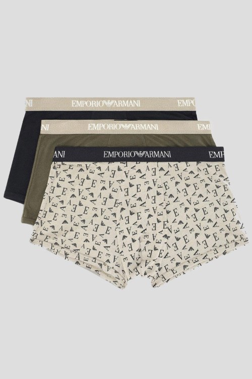 Детали: Мужской комплект хлопковых трусов от Emporio Armani (Эмпорио Армани). Фасон-боксеры, эластичный брендированный пояс. В комплекте 3 пары: черный, хаки, бежевый с принтом