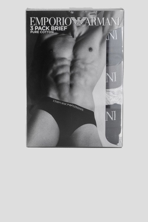 Детали: Мужские трусы из натурального хлопка от Emporio Armani (Эмпорио Армани). Комплект состоит из трех трусов черного, серого и синего цвета, модель-брифы, эластичная резинка на поясе с логотипом