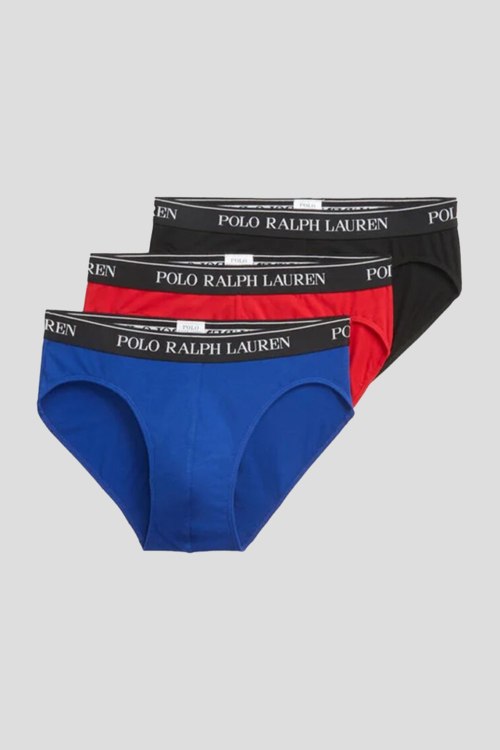 Детали: Мужские трусы из хлопкового микса от Ralph Lauren (Ральф Лорен). Комплект состоит из трех пар трусов: синего, красного и черного цвета, брендированная эластичная резинка, фирменная упаковка, модель брифы