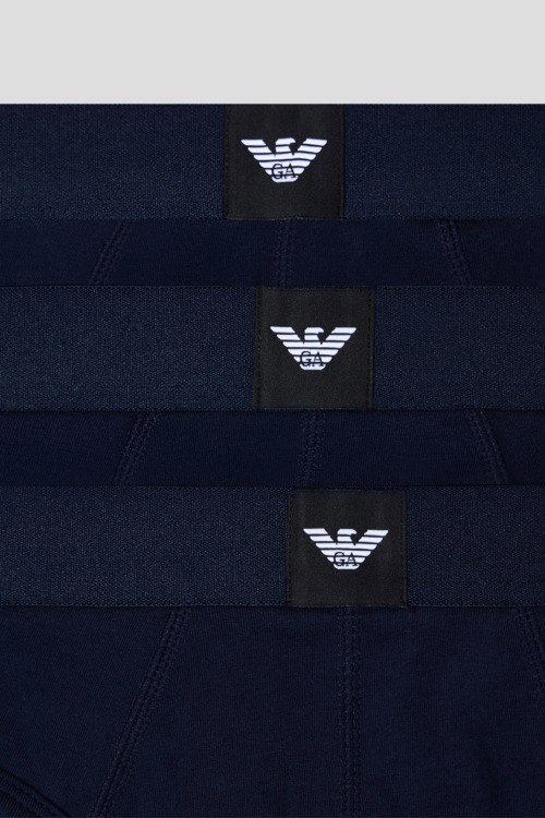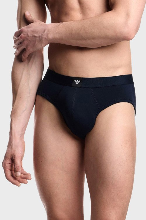 Детали: Мужской комплект темно-синих хлопковых трусов от Emporio Armani (Эмпорио Армани). Фасон-брифы, эластичный брендированный пояс. В комплекте 3 пары