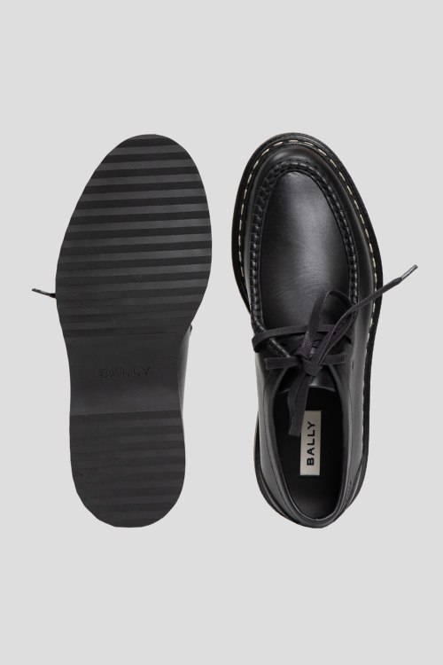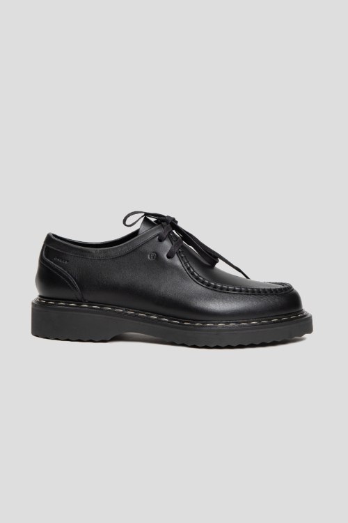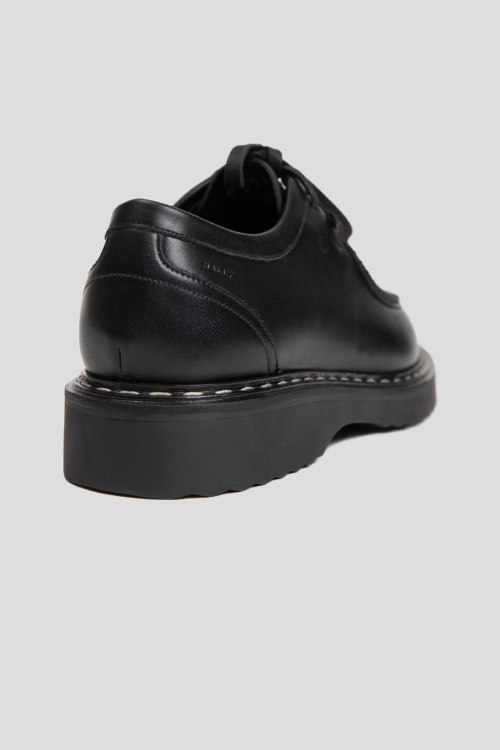 Детали: Мужские черные кожаные дерби от Bally (Балли). Модель из гладкой кожи, логотип сбоку, классическая шнуровка, закругленный носок, кожаная стелька